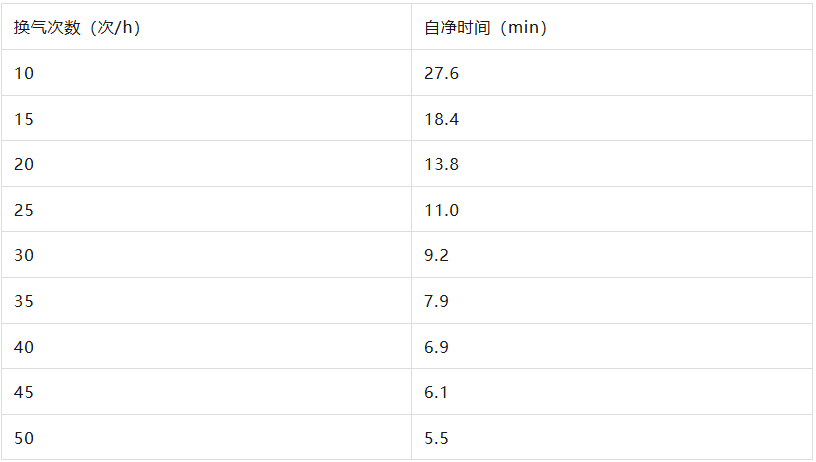 Therefore, we can calculate that the self-purification time under different air change rates is approximately: