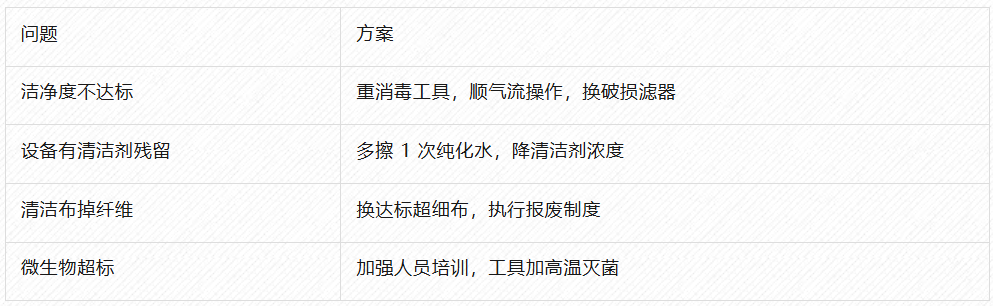 Cleaning during shutdown (night / maintenance period); Before cleaning, measure the cleanliness level using a particle counter. If it exceeds the standard, investigate (filter / personnel); Power off the equipment, and ensure there is no obstruction in the fire escape route.