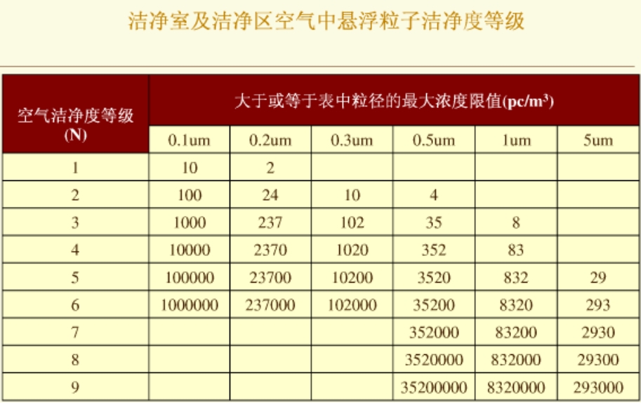 洁净室按空气清洁程度分类,如果无尘室的等级只用尘粒数目来叙述,则可假设尘粒的尺寸为0.5μm,例如,1级、10级、例如100级无尘室最大尘埃粒子数目分别小于或等于1颗、10颗、100颗。如果尘粒尺寸不是0.5μm,无尘室等级应以在一特定尘粒尺寸的级数来表示,分别分为1级、10级、100级、1000级、10000级、100000级,数值越小,净化级别就越高。洁净度越高造价就越高。