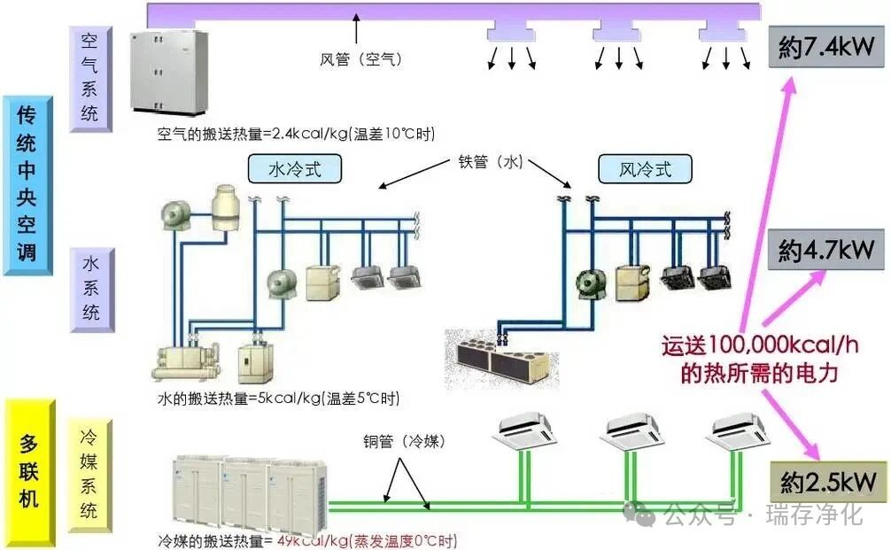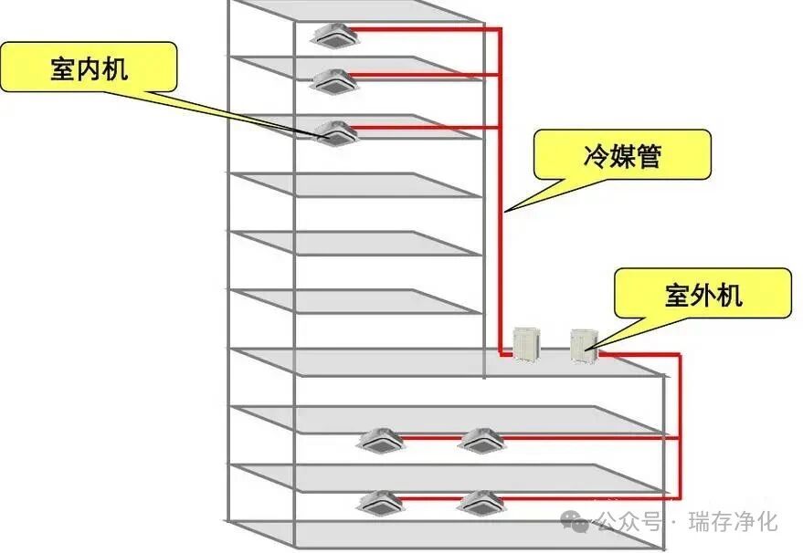 节省建筑空间:多联机系统采用的风冷式室外机一般设置在屋顶,不需要占用建筑面积。多联机系统的接管只有制冷剂管和凝结水管,且制冷剂管路布置灵活,与水系统相比,在满足相同室内吊顶高度的情况下,采用多联机系统可以减小建筑层高,降低建筑造价。